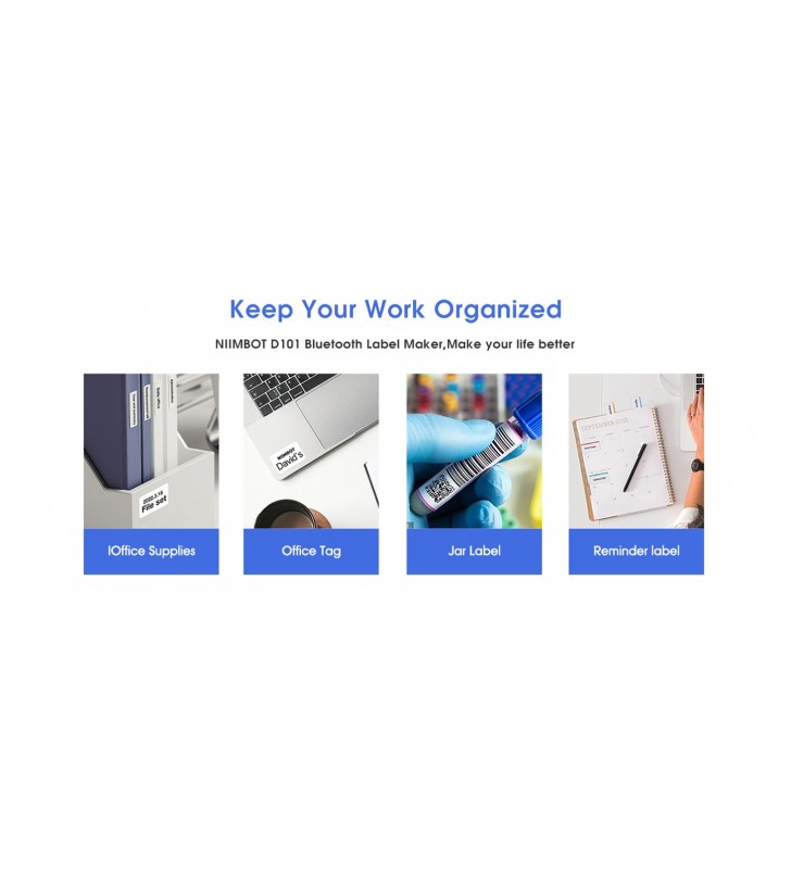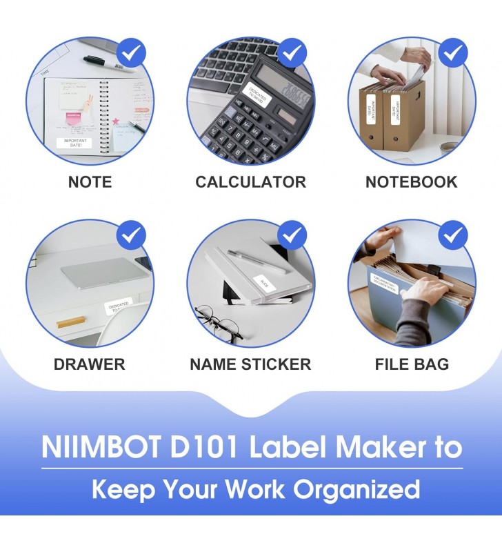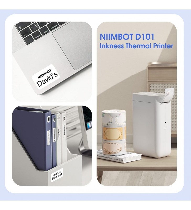 <li><strong>Ετικετογράφος Χωρίς Μελάνι:</strong> Δεν χρειάζεται πια να αγοράζετε μελάνι ή ταινίες άνθρακα! Ο ασύρματος ετικετογράφος NIIMBOT D101 χρησιμοποιεί τεχνολογία θερμικής εκτύπωσης και είναι συμβατός με ετικέτες D11/D110 12-15mm. Υποστηρίζει ετικέτες κενών και διαφανών, με αντοχή στο νερό, την τριβή και το λάδι, ισχυρή πρόσφυση και χωρίς BPA.</li>