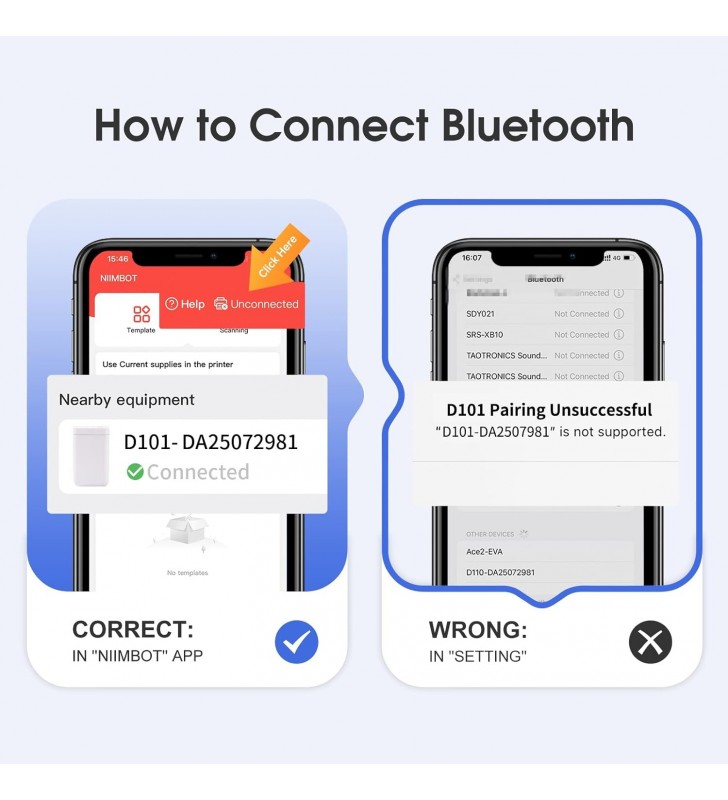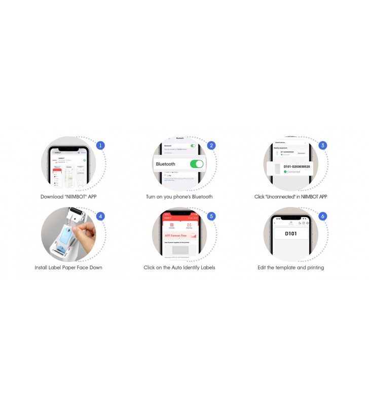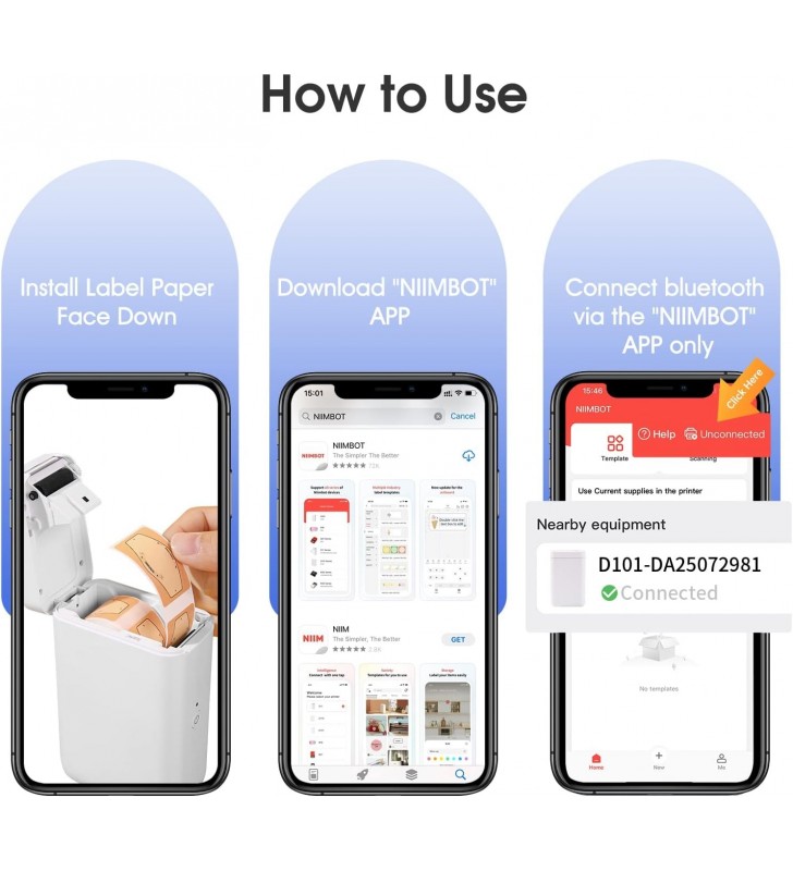 <li><strong>Εύκολος στη Χρήση:</strong> Η συσκευή δεν είναι συμβατή με iPad. Για εκτύπωση, εγκαταστήστε την εφαρμογή NIIMBOT από το App Store ή το Google Play, ενεργοποιήστε τον εκτυπωτή D101 και ανοίξτε τη σύνδεση Bluetooth. Επιλέξτε και συνδέστε το μοντέλο D101 στην εφαρμογή NIIMBOT και είστε έτοιμοι να εκτυπώσετε. Ο εκτυπωτής είναι συμβατός με συσκευές Android και iOS.</li>