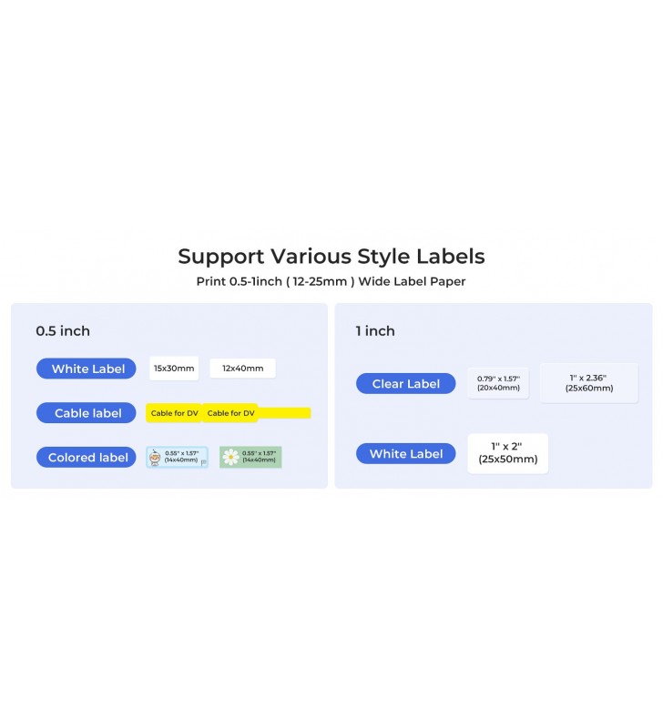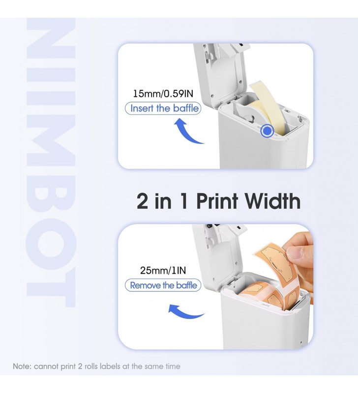 <li><strong>2 σε 1 Ετικετογράφος:</strong> Ο ετικετογράφος NIIMBOT D101 υποστηρίζει ετικέτες πλάτους από 0.4'' έως 1'' με αφαιρούμενο διαχωριστή. Μπορείτε να εκτυπώσετε ετικέτες 0.5 ιντσών για ονόματα, διακόπτες και καλώδια με τον διαχωριστή, ή να εκτυπώσετε ετικέτες τιμών ή προϊόντων 1 ιντσάς αφαιρώντας τον διαχωριστή. <em>Σημείωση:</em> Ο εκτυπωτής δεν μπορεί να εκτυπώσει δύο ρολά ετικετών ταυτόχρονα.</li>