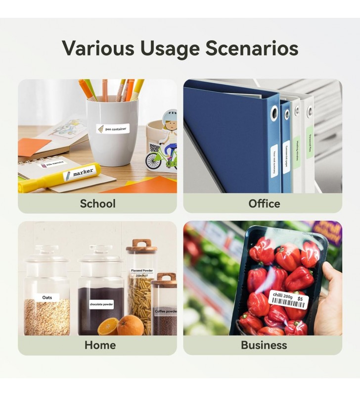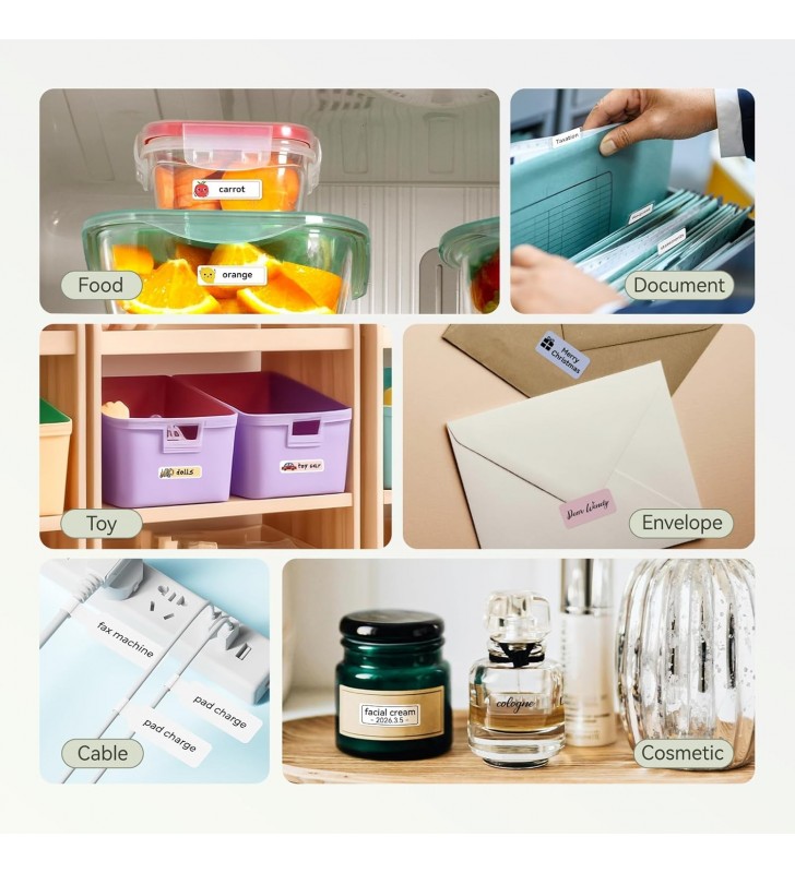 <li><strong>Ευρεία Χρήση:</strong> Υποστηρίζει εκτύπωση ετικετών με πλάτος έως 0.5 ίντσες (12.7 mm). Ιδανικός για εφαρμογές όπως η οργάνωση σπιτιού, κατηγοριοποίηση αρχείων στο γραφείο, και μικρές επιχειρήσεις. Κατάλληλος για ετικέτες βάζων, ημερομηνίες τροφίμων, καλλυντικά, προσωπικά αντικείμενα, ετικέτες ονομάτων, αναγνώριση καλωδίων, ετικέτες τιμών και κοσμήματα.</li>