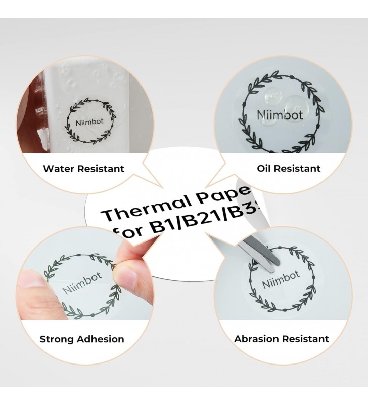 Το θερμικό χαρτί ετικετών Niimbot έχει σχεδιαστεί για χρήση με ετικετογράφους και εκτυπωτές Niimbot, περιλαμβάνοντας τα μοντέλα B21, B1, και B3S. Η συσκευασία περιλαμβάνει ένα ρολό με 150 διαφανείς στρογγυλές αυτοκόλλητες ετικέτες, διάμετρος 50mm. Οι ετικέτες είναι κατάλληλες για άμεση θερμική εκτύπωση, εξασφαλίζοντας υψηλή ποιότητα και ανθεκτικές εκτυπώσεις.